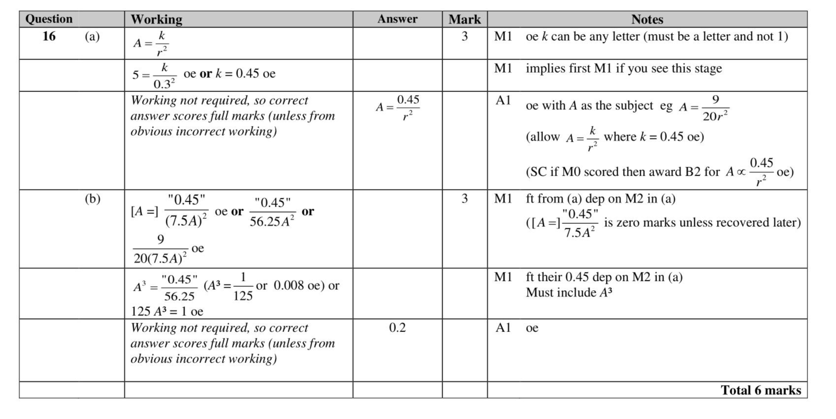 $$\(16 A\)$$ is inversely proportional to the square of $$\(r\)$$ $$\(A=5\)$$ when $$\(r=0.3\)$$ (a) Find a formula for $$\(A\)$$ in terms of $$\(r\)$$ (3) (b) Find the value of $$\(A\)$$ when $$\(r=7.5 A\)$$ $$\(A=\)$$ (3)