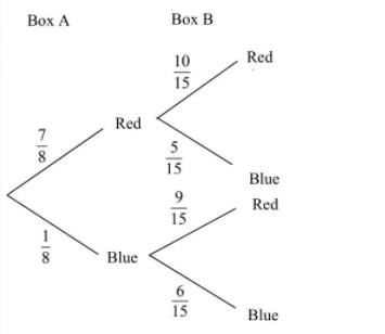 ox $$\(A\)$$ contains 7 red balls and 1 blue ball. Box $$\(B\)$$ contains 9 red balls and 5 blue balls. A ball is chosen at random from box $$\(A\)$$ and placed in box $$\(B\)$$. A ball is then chosen at random from box $$\(B\)$$. The tree diagram below shows the possibilities for the colours of the balls chosen. Complete the tree diagram to show the probabilities.