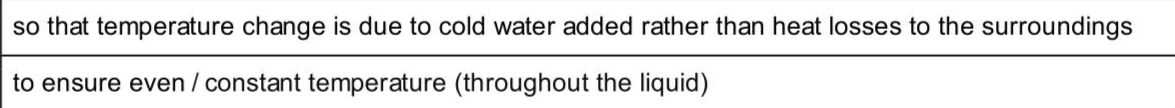 A student investigates the cooling of hot water in a beaker. The apparatus is shown in Fig. 2.1. Fig. 2.1 In the experiment, the student aims to investigate the effect on the temperature of the hot water as cold water is added. (i) Complete the sentence to explain why it is important to add the cold water without delay at each stage. The cold water is added without delay . (ii) Complete the sentence to explain the reason for stirring the water at each stage. The student stirs the water before recording the temperature .